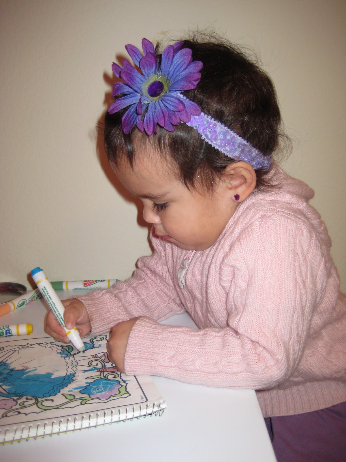 I told Alegria that today we were going to have quiet time...that she didn't have to take a nap, but that she and I were going to turn the TV off (it was on while I nursed Odette to put her down for a nap), and that we were going to just have some quiet time in her room. At first, Alegria was upset that I turned her movie off, but then when I diverted her attention to the new coloring book she got today at the store (she had completely filled up the pages of her last one), she was more than happy to join me in her room to color: